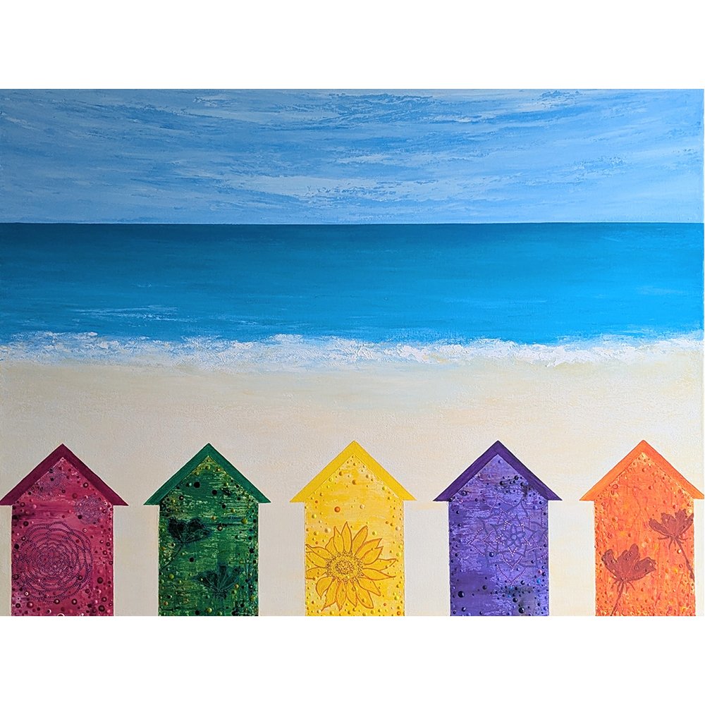 Bring a burst of coastal joy into your home with this uplifting seaside artwork, where calming ocean blues meet a row of vibrant floral beach huts, each blooming with its own personality.