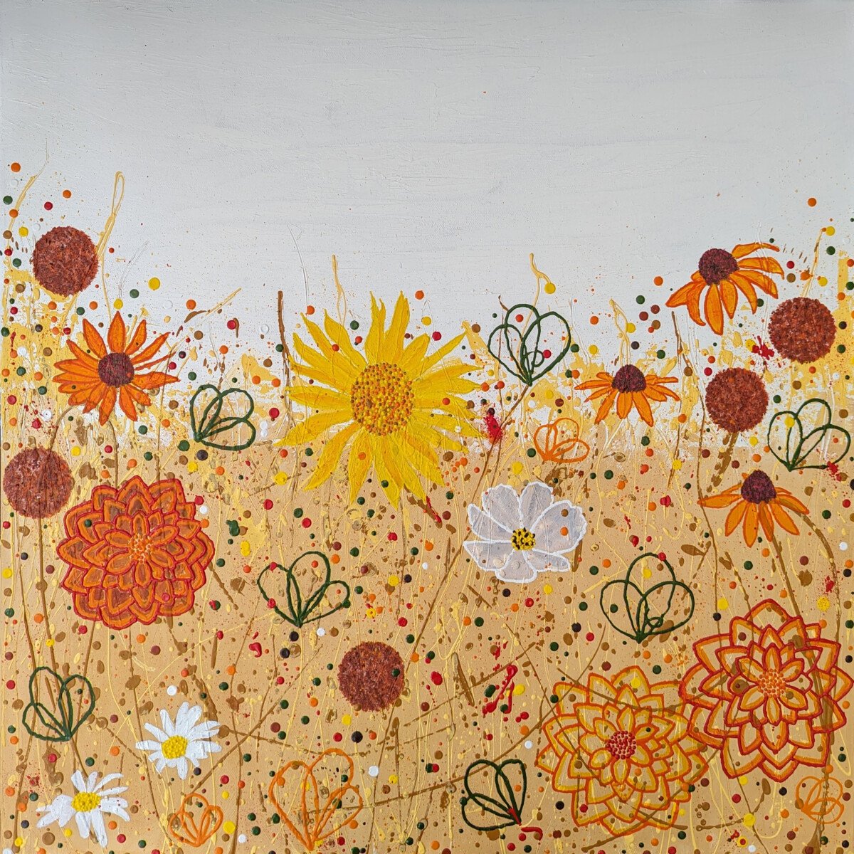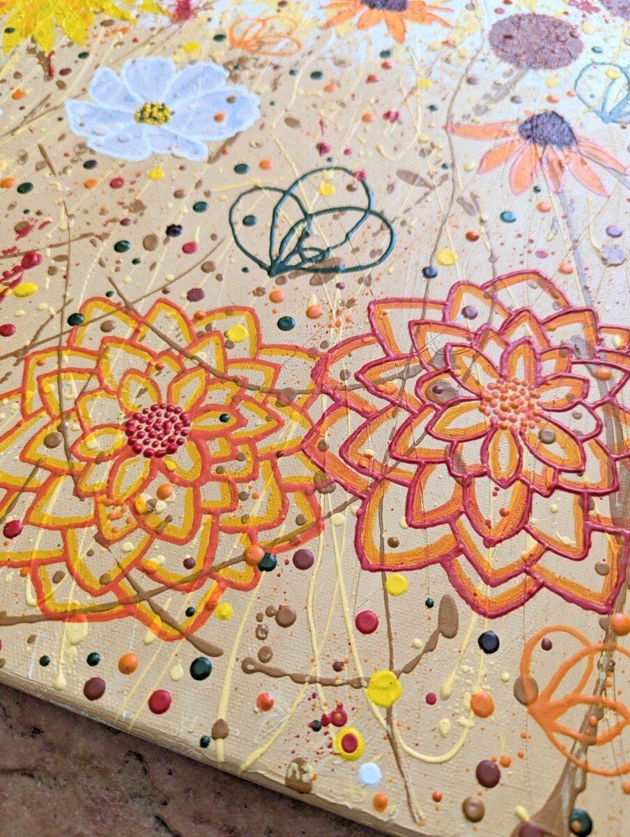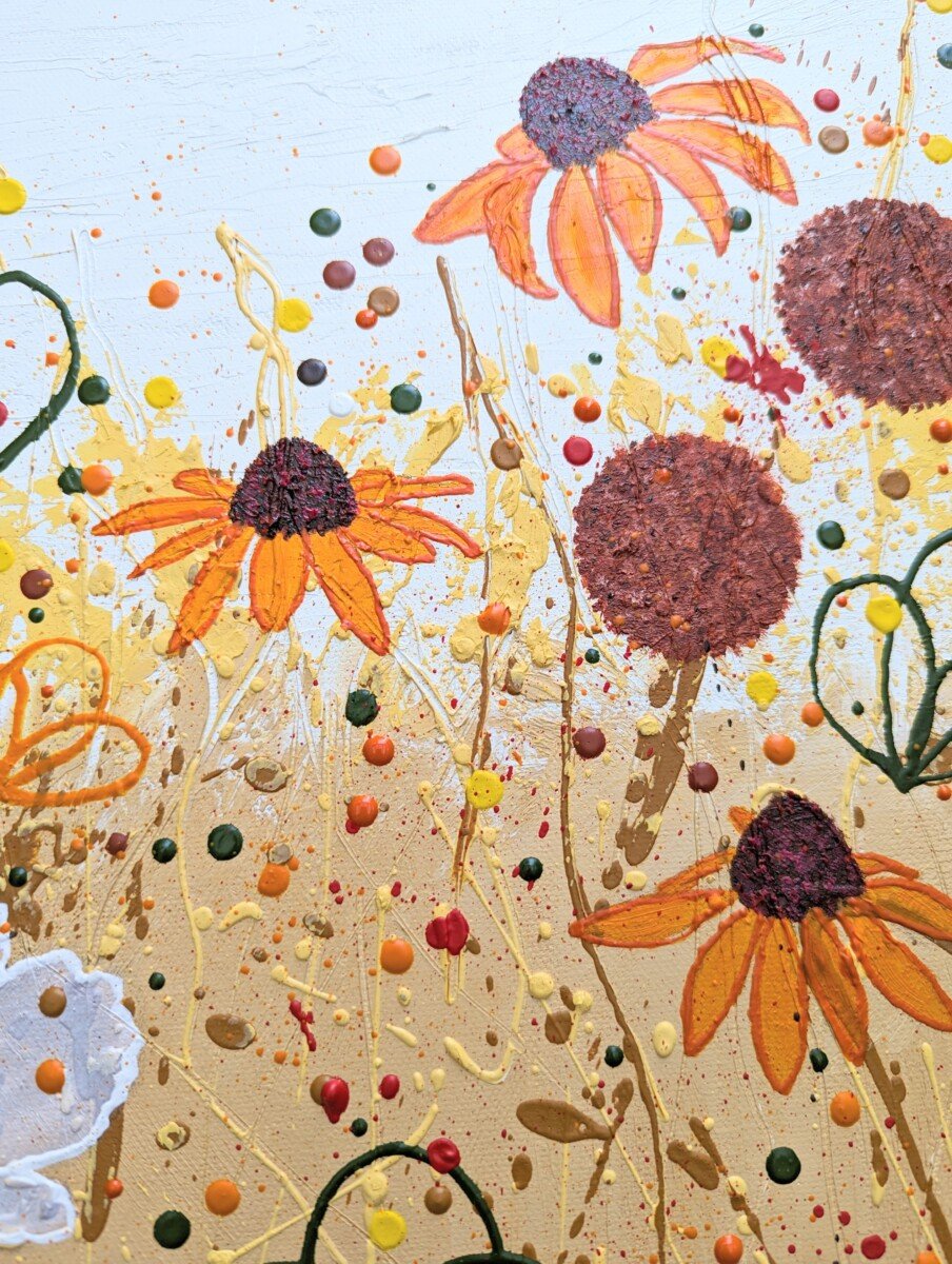 Part of my Wildflower Collection, the composition feels both chilled and dynamic, with my signature-style wildflowers layered over a richly textured background. Pops of warm orange, mustard yellow, and earthy browns dance across the print, evoking long summer days, open fields, and the sound of music drifting on the breeze.