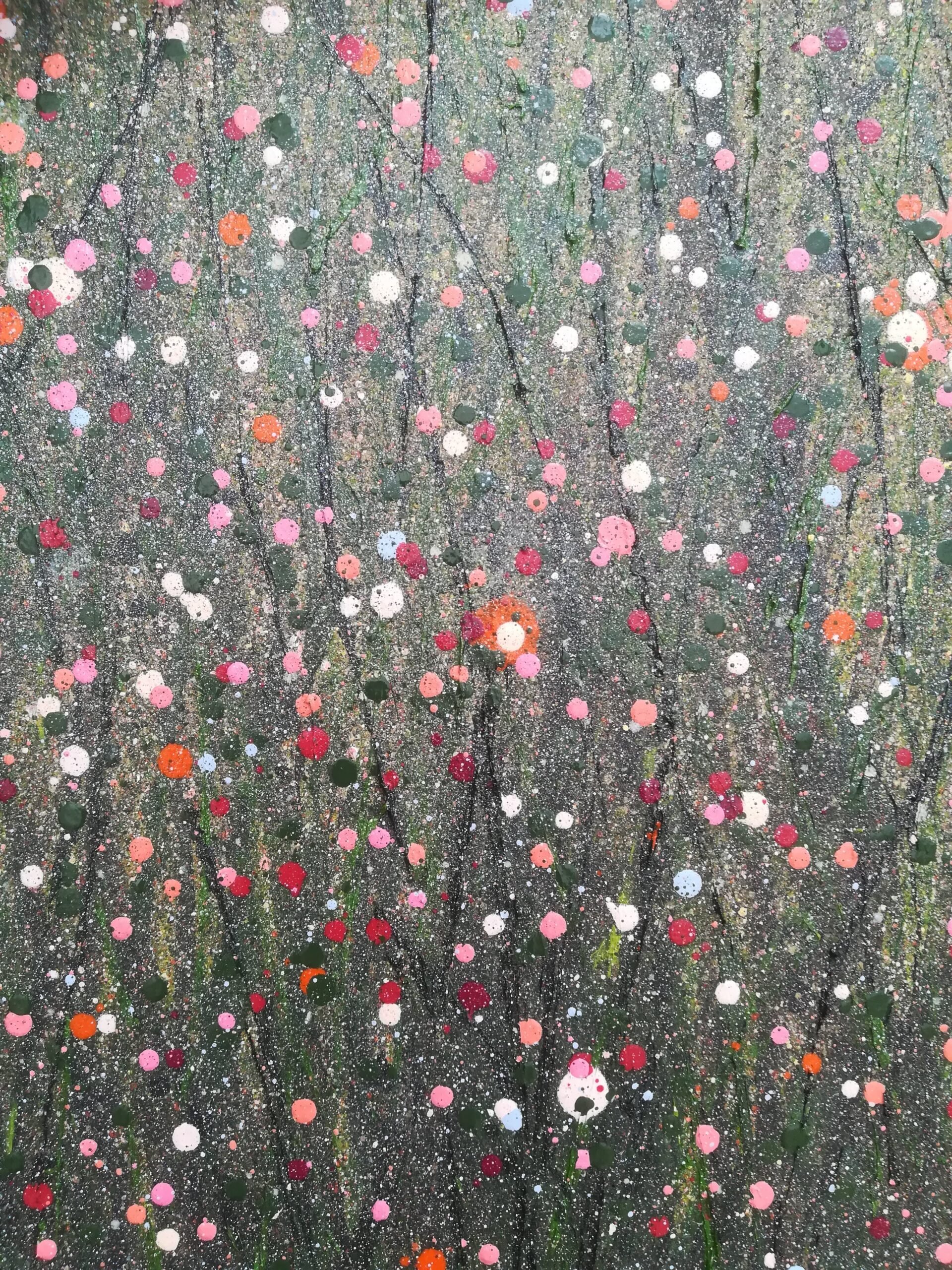 In the night garden is an abstract oil floral drip painting. Created using grungy shades of greens and dark tones and layered with pretty vibrant floral droplets. It’s an enchanting piece and has so many layers to explore. Viewing it has a calming effect, possibly due to its toned down qualities, as if designed with tranquility in mind.