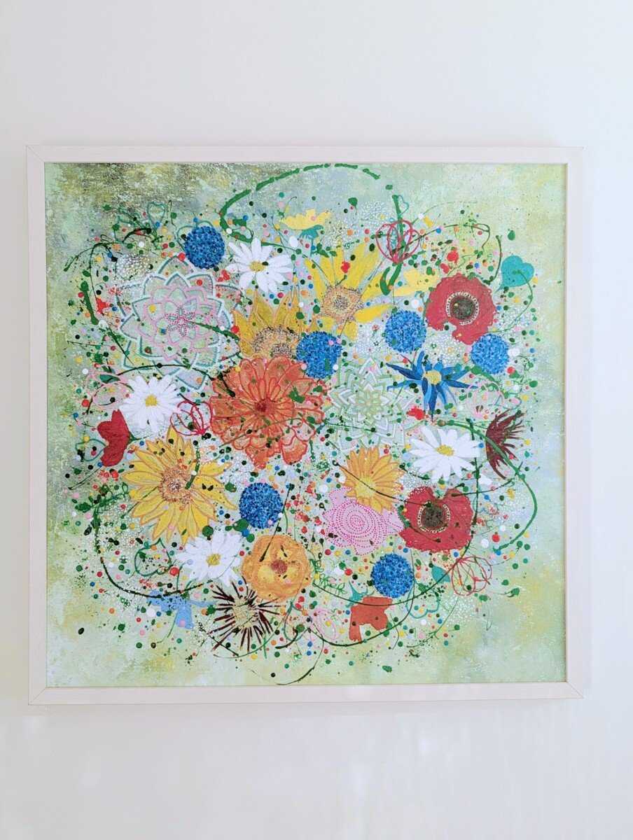 Set on a lush, textured background of soft green tones, this piece is a dance of vivid wildflowers, mandala-style floral motifs, and confetti-like paint droplets. Itโs full of vibrant energy, featuring sunny yellows, fiery oranges, bold blues, and deep crimson reds, all intertwined with whimsical stems and swirling botanical lines. Each bloom has been layered with love, creating a textured surface youโll want to reach out and touch.